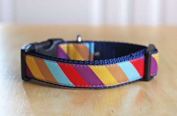 Here's a bit of design work from months ago. I just got samples in the mail. My client L.L. Lily was approached by JC Penney to produce some exclusive dog collar sets, and I was contracted to create designs for the woven ribbon that goes on them. "Something Ellen deGeneres would like" was the instruction. (Apparently Ellen would have a hand in picking the designs, being the official JCP spokesperson.) Um... I have no idea what Ellen's taste in dog collars is. And I have no idea if she ever saw them, but these two options were selected: retro-style greetings and a basic stripe.