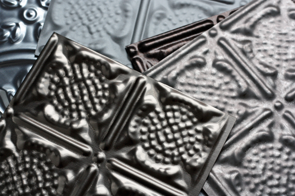 Fasade panels come in different sizes for walls, ceilings, and backsplashes in a variety of finishes and designs: modern, traditional, and industrial. I chose from the traditional category to match the look of the mantel, and selected the pattern with the smallest repeat so that more than one square would show along the sides of the fireplace cover. Traditional 6 in Brushed Nickel was my pick (the left-most swatch in the Before photo and the top swatch above).